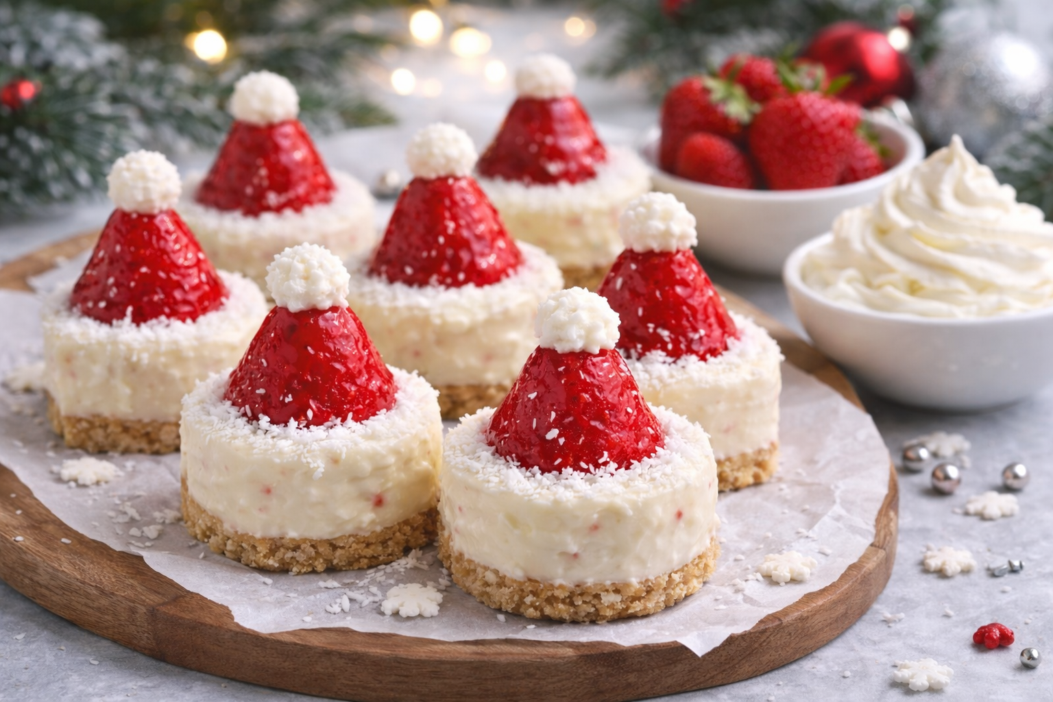 Little no-bake cheesecake bites dressed up as Santa hats, with creamy white chocolate filling, a buttery biscuit base, and juicy strawberries topped with fluffy whipped-cream pom-poms. Sweet, festive, and made for sharing (or quietly sneaking from the fridge)